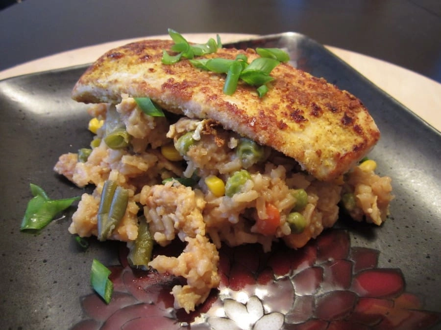 Once the edges of the fish start to turn white about halfway up the sides of the fish, gently flip the filet, and cook for a few more moments until the bottom is golden brown and comes away from the pan easily. By this time, your rice is probably done, so remove the fish to a platter to let it rest. Pour the two scrambled eggs into the hot pan, and scramble. (You can also use egg whites, but I was feeling frisky.) Once the eggs are mostly cooked, chuck in the rest of the rice, and pour your soy sauce, rice wine vinegar, and the juice from the pineapple over the top. Mix it all together quickly, making sure a little soy gets over everything. Spoon the rice onto your plate, and serve the Mahi Mahi right on top. Garnish with some lovely scallions, and voila! You have a lovely meatless, protein-filled, healthy dinner perfect for Lent!