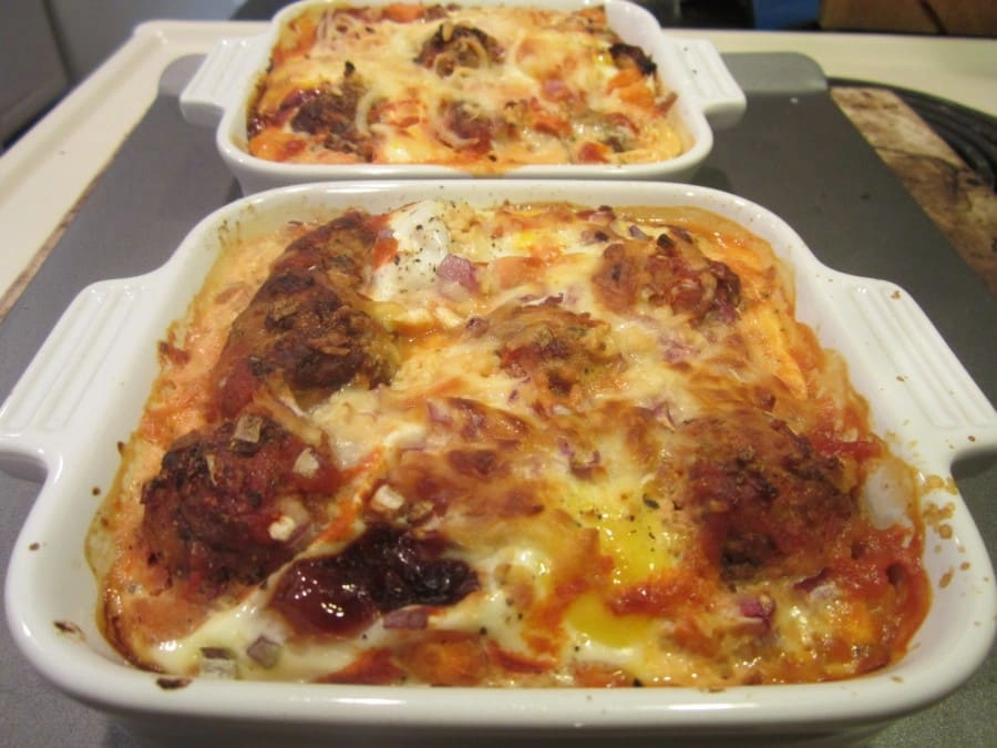 Preheat your oven to 375 degrees, and arrange individual sized baking dishes on a cookie sheet. Lightly spray them with PAM. Lay down a layer of kale first, and whatever additional vegetables you want to use. Then, ladle in your tomato sauce, and nestle in the meatballs, onion, and garlic. If you want a spicy egg bake, sprinkle some hot sauce in with the tomato sauce. Crack the two eggs right over the top, and season with salt and pepper. Sprinkle your cheese on top of everything, and bake in the oven for 20-25 minutes, depending on how done you like your eggs.