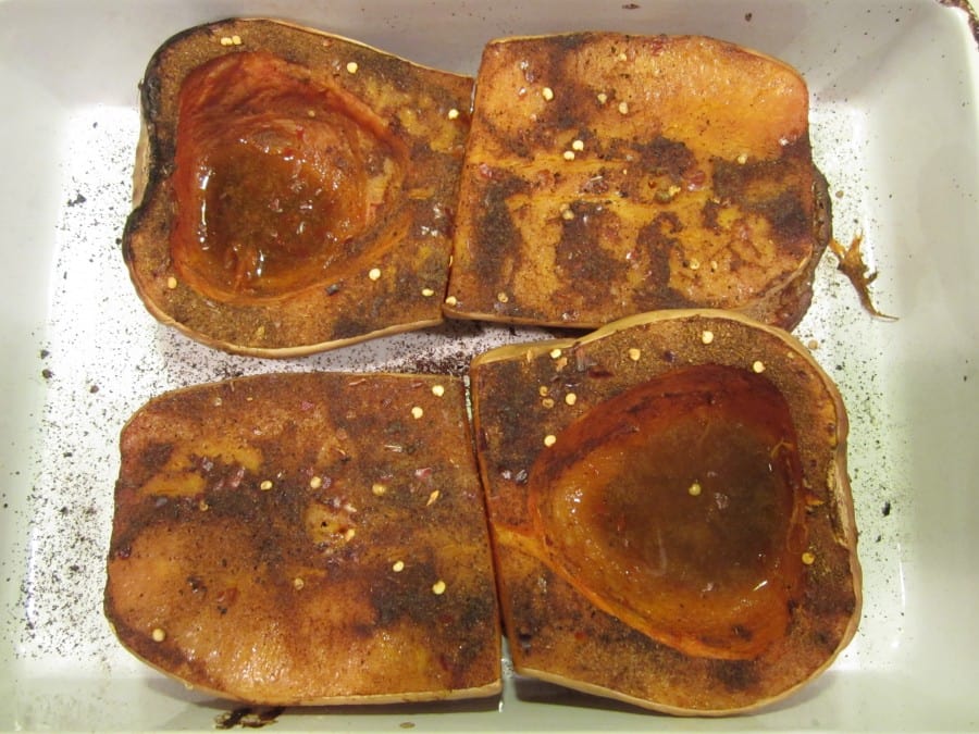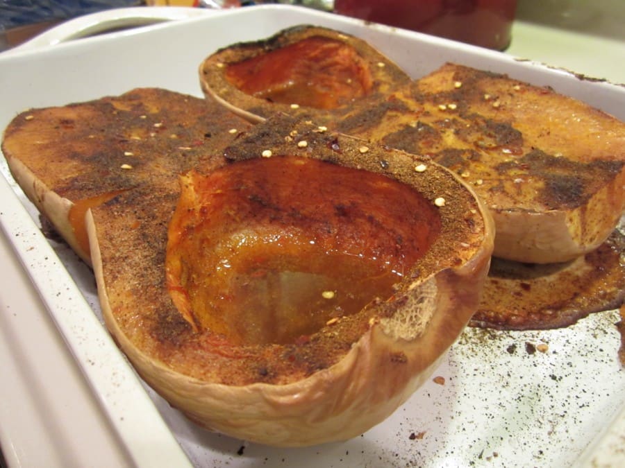 Preheat your oven to 375 degrees. Line or spray a large lasagna or brownie pan with PAM or another no-calorie cooking spray. Cut your squash in half across first, and then cut in half again lengthwise. This makes it very easy to cut, instead of struggling to get your knife through from the top to the bottom all at once! Scoop out the seeds and connective strands, and then lay out in the pan, cut sides facing up. Sprinkle generously with salt, and then hit each half of the squash with a tablespoon of cinnamon, ginger, and garam masala. Cover with some aluminum foil, and bake in the oven for about an hour.